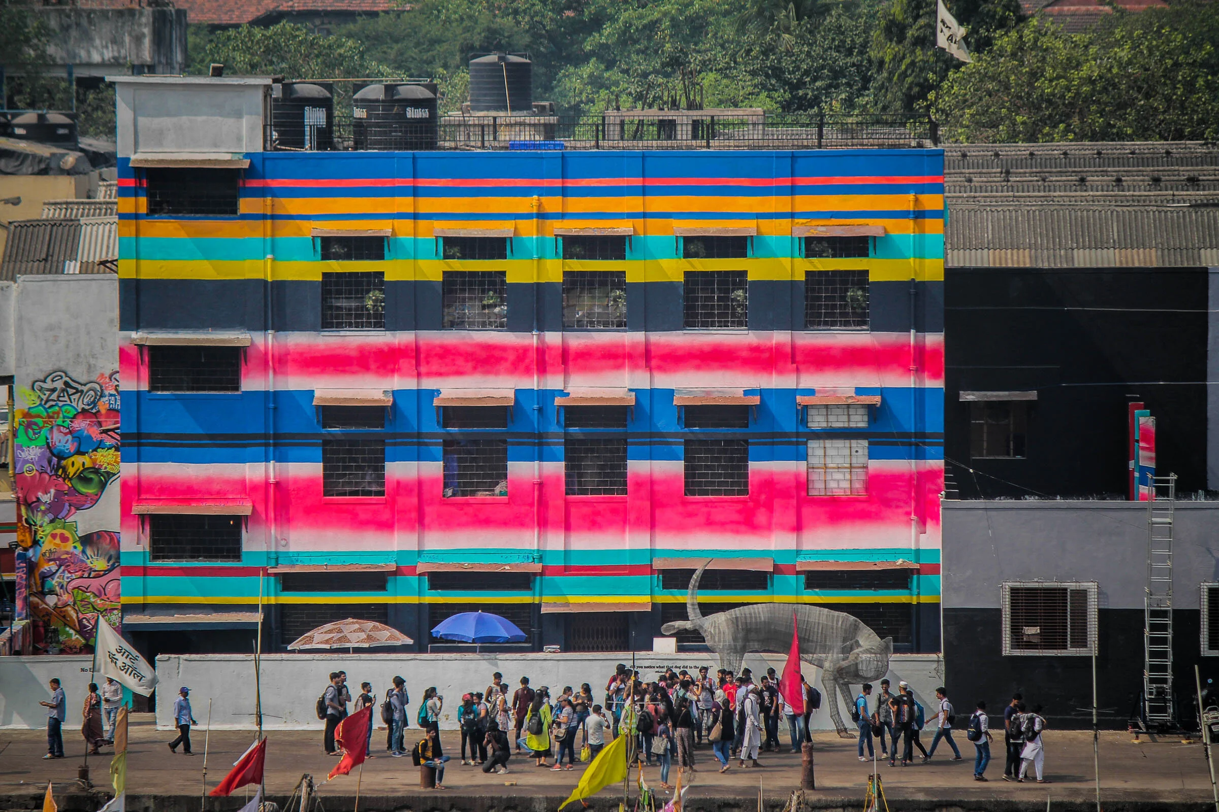 In a consistent partnership with Facebook, XXL has curated several artist led projects as part of this program in India. In 2018, when Facebook opened a new headquarters in Delhi NCR’s Gurugram, XXL invited Do & Khatra. From the streets of the capital to indoor walls, their abstract shapes and colours hypnotize the viewer. The gaze is engaged in an imaginative discovery amidst the multiple layers of their pieces where the elements are tight by a hidden narrative. Here, they visualised the constant flow of life which never stops, the giant roads and variety of people as key features of Gurugram. Vivid colours and 3D elements such as acrylic sheets cut outs open new dimensions to the bidimensional surface while offering a unique identity to the space.